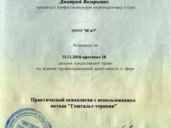 — в 2016-м сертифицировался по специальности «Практическая психология с использованием метода Гештальт-терапии» (МИГИП)